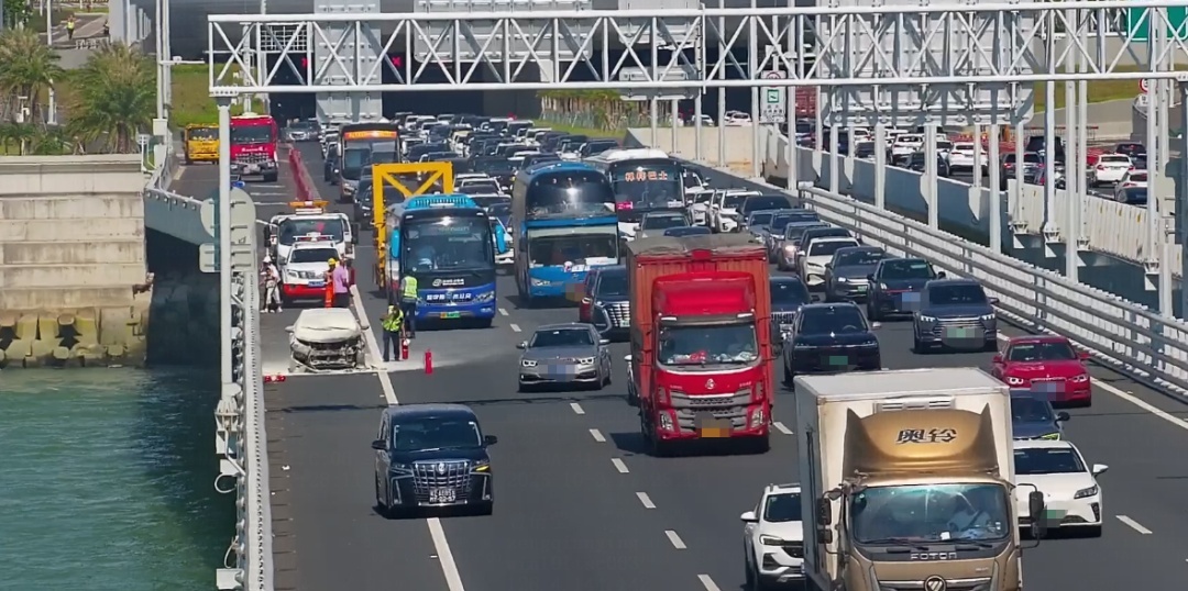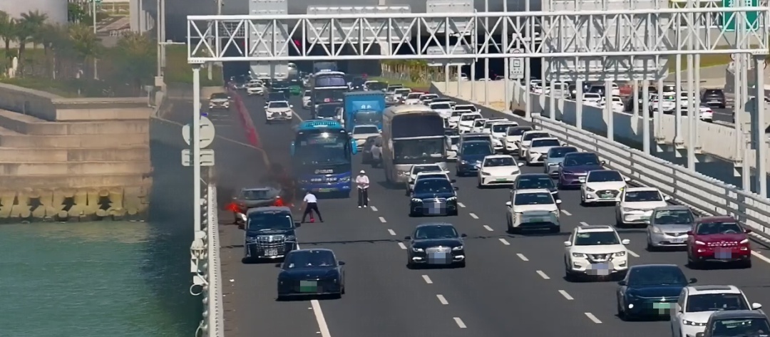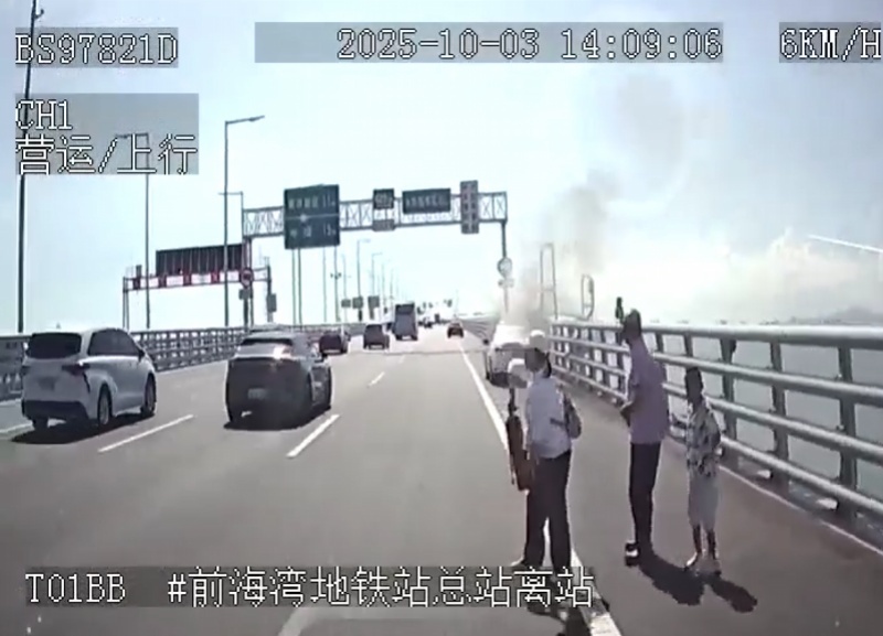 深中通道一车辆起火,一家三口在路边求援。来源:深圳巴士集团